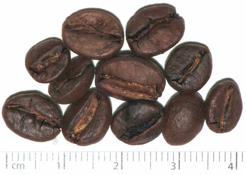 Form and color. Raw Arabica coffee beans are green in color and turn brown once roasted. The shape of the beans is oval and slightly elongated.
