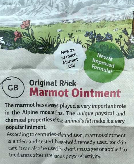 This Austrian marmot oil cream has a long history in folk medicine for the treatment of muscle or joint pain. In 1980 I had purchased the same cream in Austria and this was the package insert: