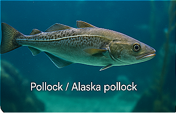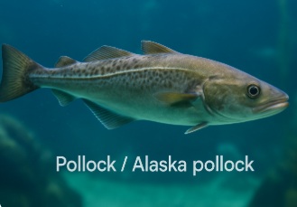 Alaska pollock (Gadus chalcogrammus, previously Theragra chalcogramma) is a gadid closely related to cod, fished mainly in the North Pacific (Bering Sea, Gulf of Alaska).