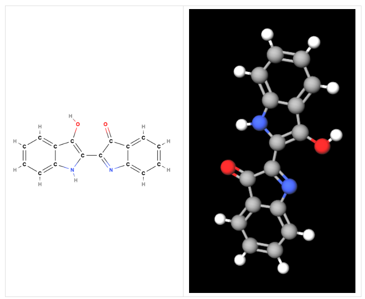 Indigo (CI 73000), 2-(1,3-Dihydro-3-oxo-2H-indazol-2-ylidene)-1,2-dihydro-3H-indol-3-one è noto come Blu di indaco, un colorante artificiale utilizzato prevalentemente nell'industria tessile e nella colorazione di prodotti cosmetici.