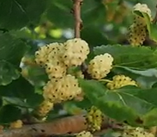 The flowers of Morus alba are small, inconspicuous and grouped in distinct male and female catkins, reflecting the variable sexual systems of the species (monoecious, dioecious or polygamous depending on population and clone). After pollination, the plant produces characteristic fleshy pseudofruits, which are in fact infructescences known botanically as soroses: aggregates of small druplets fused together into an elongated, soft, juicy structure. The colour ranges from white-cream to pink and sometimes darker shades in selected forms. The ripe fruits are edible, with a sweet, delicate flavour, and are eaten fresh or processed into juices, jams and other products, although their high perishability and delicate texture limit large-scale commercial distribution compared with other fruits.