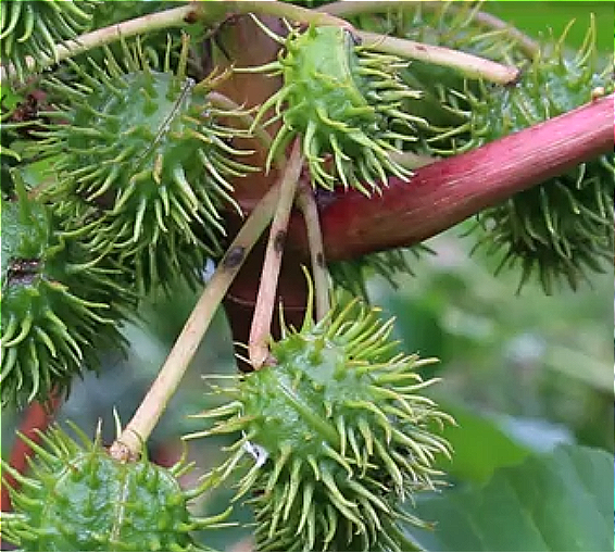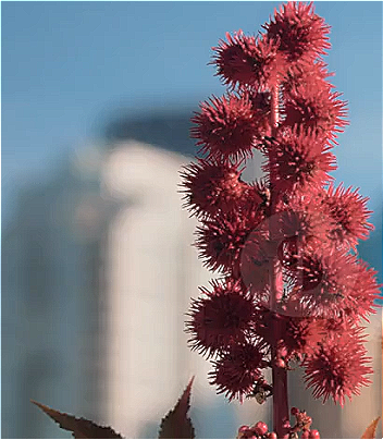 The plant exhibits a vigorous growth habit, developing into a tall herbaceous–shrubby form that may reach 3 to 5 metres in favourable warm climates. The stems are thick, initially succulent and later more lignified, sometimes displaying reddish pigmentation in ornamental cultivars. The foliage is particularly distinctive: the large, glossy, palmately lobed leaves, bearing five to eleven sharply pointed lobes, give the plant a tropical appearance and contribute significantly to its widespread use as an ornamental species. The inflorescences occur as erect terminal panicles, bearing male and female flowers on the same plant. The fruit is a spiny, trilocular capsule which, upon maturation, splits open explosively to release three smooth, marbled castor seeds, commonly but inaccurately referred to as “beans.”