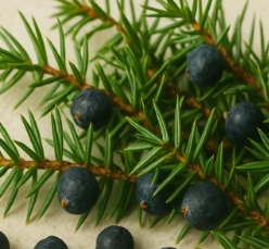 The composition of juniper galbules includes a substantial proportion of water, along with simple sugars, organic acids, tannins and phenolic phytochemicals, as well as traces of minerals such as potassium and calcium. Particularly important is the content of essential oil, located in secretory structures within the berries and characterised by monoterpenes such as α-pinene, sabinene, limonene and other compounds responsible for the aromatic, balsamic and resinous notes. The quality and yield of the oil vary according to geographical origin, ripening stage, soil and climate conditions, and extraction technique.
