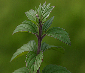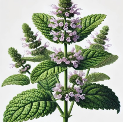 Morphologically, bergamot mint is a vigorous, fast-growing herb with quadrangular stems, often tinged purple, that spread by rhizomes and stolons to form dense patches. The leaves are opposite, ovate with a finely serrated margin, dark green and frequently suffused with violaceous tones along the veins and edges. They are rich in glandular trichomes that accumulate the essential oil. When crushed, the foliage releases a sweet, citrus–floral scent with lavender-like nuances, clearly different from the sharper “cold” aroma of classic peppermint. The flowers are small, lilac to pale purple, borne in dense terminal spikes in summer; they offer abundant nectar and attract bees and other pollinators.