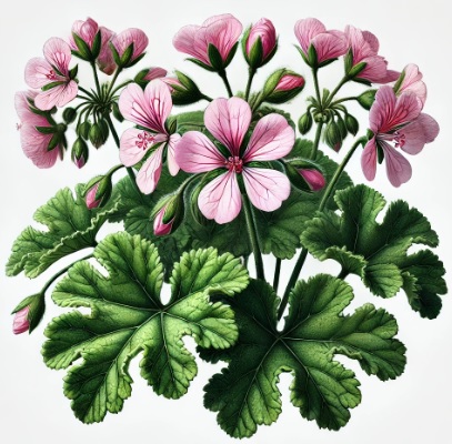 Leaves: The leaves are rounded, deeply lobed, and covered with fine hairs that give them a velvety texture. They emit a distinctive rose-like fragrance when crushed.