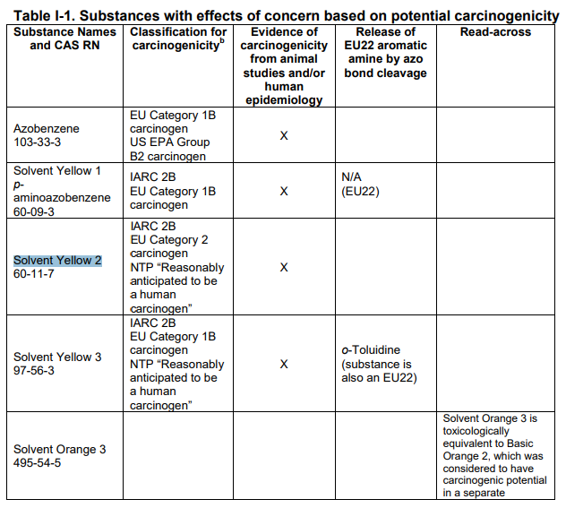 Solvent Yellow 2 is a synthetic azo dye primarily used in industrial applications such as coloring oils, waxes, plastics, and sometimes fuels. This dye produces a bright yellow hue and has historically been used in various manufacturing processes. However, its use in consumer products has been heavily restricted or banned due to its classification as a possible human carcinogen. Regulatory bodies, including the International Agency for Research on Cancer (IARC), have classified Solvent Yellow 2 as a Group 2B carcinogen, meaning it is “possibly carcinogenic to humans.” The European Union places it in Category 2 for its carcinogenic risk, while the U.S. National Toxicology Program (NTP) has listed it as “reasonably anticipated to be a human carcinogen.”