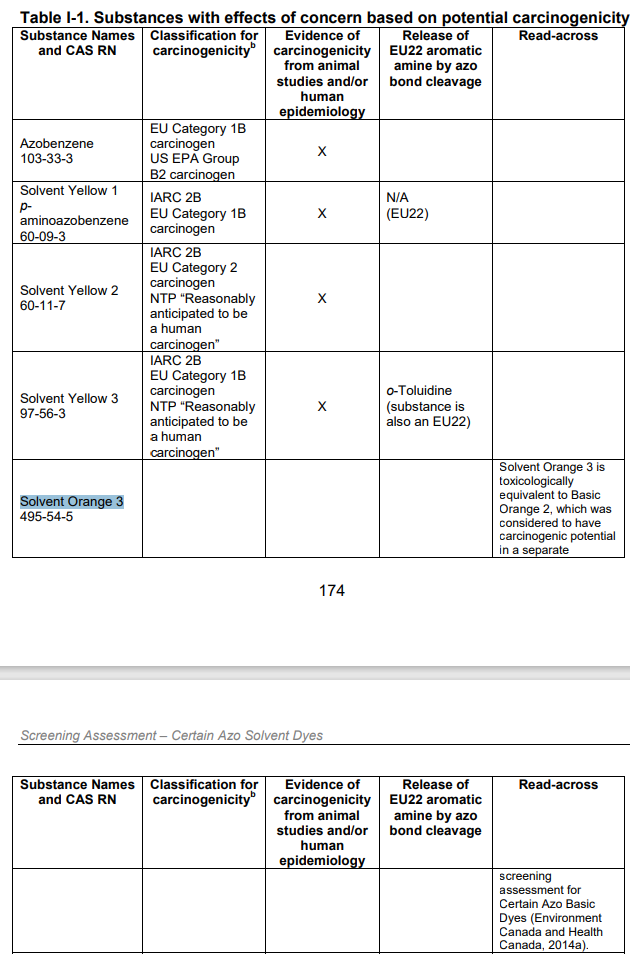 Synopsis. Pursuant to sections 68 or 74 of the Canadian Environmental Protection Act, 1999 (CEPA 1999), the Ministers of the Environment and of Health have conducted a screening assessment on 22 Azo Solvent Dyes. These substances constitute a subgroup of the Aromatic Azo and Benzidine-based Substance Grouping being assessed as part of the Groupings Initiative of Canada’s Chemicals Management Plan (CMP) based on structural similarity and applications. Substances in this grouping were identified as priorities for assessment as they met the categorization criteria under subsection 73(1) of CEPA 1999 and/or were considered as a priority based on other human health concerns. The Chemical Abstracts Service Registry Number (CAS RN)1, Domestic Substances List (DSL) name, and Colour Index (C.I) name or common name of the 22 substances are presented in the following table.....