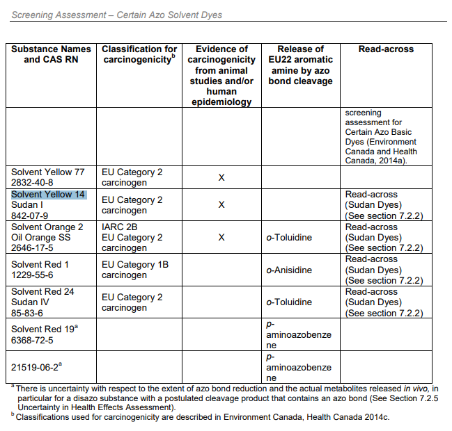 Synopsis. Pursuant to sections 68 or 74 of the Canadian Environmental Protection Act, 1999 (CEPA 1999), the Ministers of the Environment and of Health have conducted a screening assessment on 22 Azo Solvent Dyes. These substances constitute a subgroup of the Aromatic Azo and Benzidine-based Substance Grouping being assessed as part of the Groupings Initiative of Canada’s Chemicals Management Plan (CMP) based on structural similarity and applications. Substances in this grouping were identified as priorities for assessment as they met the categorization criteria under subsection 73(1) of CEPA 1999 and/or were considered as a priority based on other human health concerns. The Chemical Abstracts Service Registry Number (CAS RN)1, Domestic Substances List (DSL) name, and Colour Index (C.I) name or common name of the 22 substances are presented in the following table.....