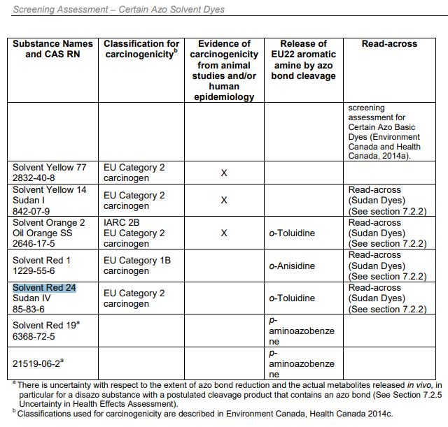 Synopsis. Pursuant to sections 68 or 74 of the Canadian Environmental Protection Act, 1999 (CEPA 1999), the Ministers of the Environment and of Health have conducted a screening assessment on 22 Azo Solvent Dyes. These substances constitute a subgroup of the Aromatic Azo and Benzidine-based Substance Grouping being assessed as part of the Groupings Initiative of Canada’s Chemicals Management Plan (CMP) based on structural similarity and applications. Substances in this grouping were identified as priorities for assessment as they met the categorization criteria under subsection 73(1) of CEPA 1999 and/or were considered as a priority based on other human health concerns. The Chemical Abstracts Service Registry Number (CAS RN)1, Domestic Substances List (DSL) name, and Colour Index (C.I) name or common name of the 22 substances are presented in the following table.....