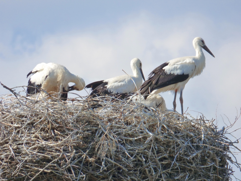 Behavior and Habits: White storks are monogamous and often return to the same nest year after year, improving and reusing it over time. These nests can grow very large and heavy. The stork is known for its social behavior during migration, forming large flocks that use thermal currents to glide over long distances without constant wing-flapping. During the breeding season, the female lays between 3 to 5 eggs, which are incubated by both parents for about a month. After hatching, the chicks remain in the nest for approximately two months before they are ready to fly.