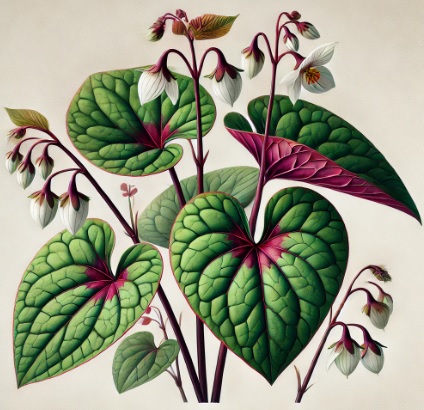 Houttuynia cordata is a low-growing herb that reaches a height of 30–60 cm. It has distinctive heart-shaped leaves that vary in color from green to purplish-red, depending on light exposure. The plant produces small white flowers with a yellowish spike in late spring. Its underground rhizomes allow it to spread rapidly, making it suitable for ground cover in damp and partially shaded areas. The plant emits a strong aroma reminiscent of fish, particularly when crushed, which is why it is often referred to as fish mint.