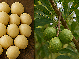 High–oil tree nuts with a very high MUFA content and a sweet–buttery flavor. Consumed as snacks and in bakery/confectionery; also a source of culinary and cosmetic macadamia oil.