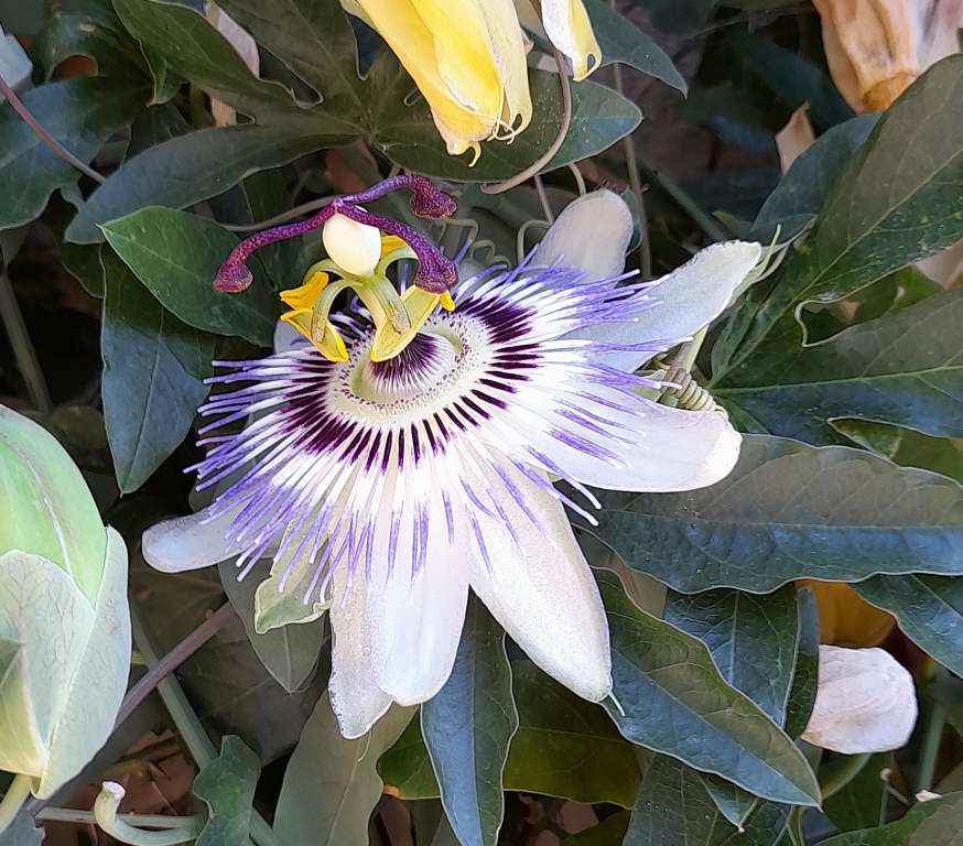 Flowers: June–September; large (5–9 cm in diameter), white to violet, with a distinctive corona of blue-purple filaments; highly ornamental and lightly fragrant.
