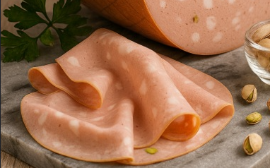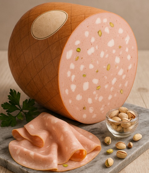 Cooked cured meat made from finely emulsified pork with dispersed fat cubes (lardelli) from firm backfat, seasoned with salt and spices (black pepper; sometimes coriander, nutmeg, garlic), plus antioxidants/preservatives per regulation. In Italy, Mortadella Bologna PGI sets specific raw-material and process rules. Pistachios are optional.