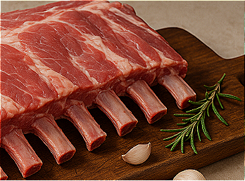 High-quality myofibrillar proteins (myosin/actin); elevated collagen/connective tissue (especially in spare ribs). B vitamins (B1, B3, B6); minerals: P, Zn, Se; Fe moderate. Cholesterol ~70–95 mg/100 g (higher with fattier racks).