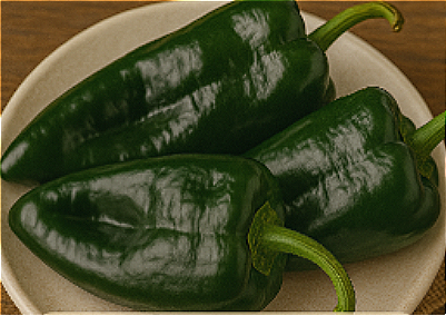 Note: Poblano is a Mexican chili pepper characterized by large, fleshy, cone-shaped fruits with low pungency and a rich, vegetal–aromatic flavour. When fully ripe it turns dark red; once dried it is known as ancho. It is one of the key chilies in traditional Mexican cuisine.