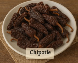 Nota: Il chipotle non è una specie distinta, ma un jalapeño maturo (rosso) che viene affumicato lentamente – tradizionalmente con legno di noce pecan o quercia – e successivamente essiccato. Il risultato è un peperoncino dal sapore affumicato, dolce, aromatico e moderatamente piccante, molto usato nella cucina messicana.