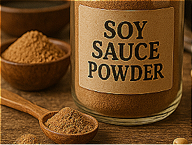 Soy sauce powderDescriptionDehydrated preparation obtained by spray-drying fermented soy sauce onto carbohydrate carriers (e.g., maltodextrin, modified starch), sometimes with anti-caking agents (e.g., silica) and salt.Sensory profile: pronounced umami, salty, toasty, lightly caramel notes; brown color.Variants: from shoyu (soy + wheat), tamari (gl... (Read the full Tiiip)
