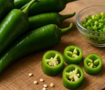 Immature fruits of Capsicum spp. (mainly C. annuum; sometimes C. frutescens, family Solanaceae). Common types: Anaheim/Hatch (mild), jalapeño, serrano, and long frying peppers.