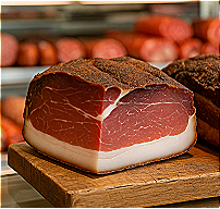 • Traditional cured pork product obtained from the hind leg, seasoned and cold-smoked, then dry-aged for several months.