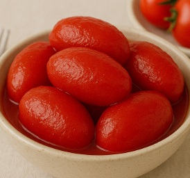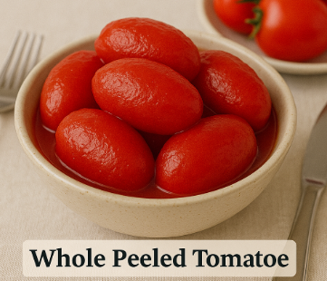 Whole peeled tomatoes are a preserved food product obtained from ripe Solanum lycopersicum tomatoes (family Solanaceae) that are blanched, peeled, and packed whole in tomato juice. They retain their elongated shape, soft yet firm flesh, and characteristic bright red color. They are a staple of traditional and industrial tomato processing.