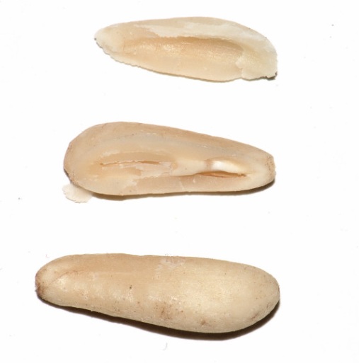 typical size: a few millimetres in diameter, about 1–2 cm in length (for Mediterranean pine nuts)