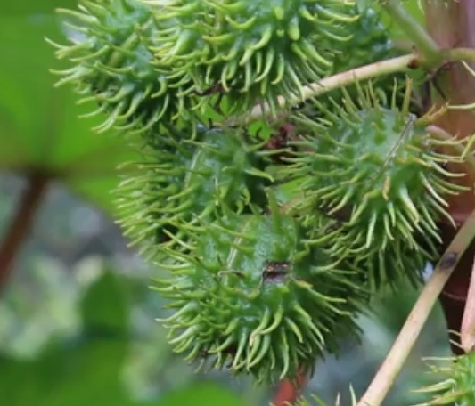 The plant exhibits a vigorous growth habit, developing into a tall herbaceous–shrubby form that may reach 3 to 5 metres in favourable warm climates. The stems are thick, initially succulent and later more lignified, sometimes displaying reddish pigmentation in ornamental cultivars. The foliage is particularly distinctive: the large, glossy, palmately lobed leaves, bearing five to eleven sharply pointed lobes, give the plant a tropical appearance and contribute significantly to its widespread use as an ornamental species. The inflorescences occur as erect terminal panicles, bearing male and female flowers on the same plant. The fruit is a spiny, trilocular capsule which, upon maturation, splits open explosively to release three smooth, marbled castor seeds, commonly but inaccurately referred to as “beans.”