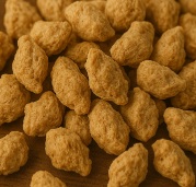 Morphologically, soy chunks appear as porous, irregular pieces of light beige colour with a hard texture when dry. Once rehydrated, they develop a soft, fibrous consistency similar to that of meat, which makes them a key ingredient in many plant-based alternatives to traditional protein dishes.