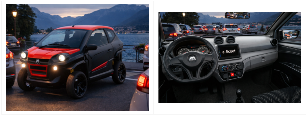 The Aixam Mega e-Scouty is an L6e electric minicar (top speed 45 km/h) with a more “crossover” attitude than typical segment citycars: mini-SUV look, higher seating, and a more distinctive design. It is intended for urban and light peri-urban use: easy parking, simple driving (automatic/variator-type transmission), and equipment aimed at delivering a “car-like” experience (infotainment, rear camera, connectivity) while staying within the technical and legal limits of a 45 km/h vehicle.