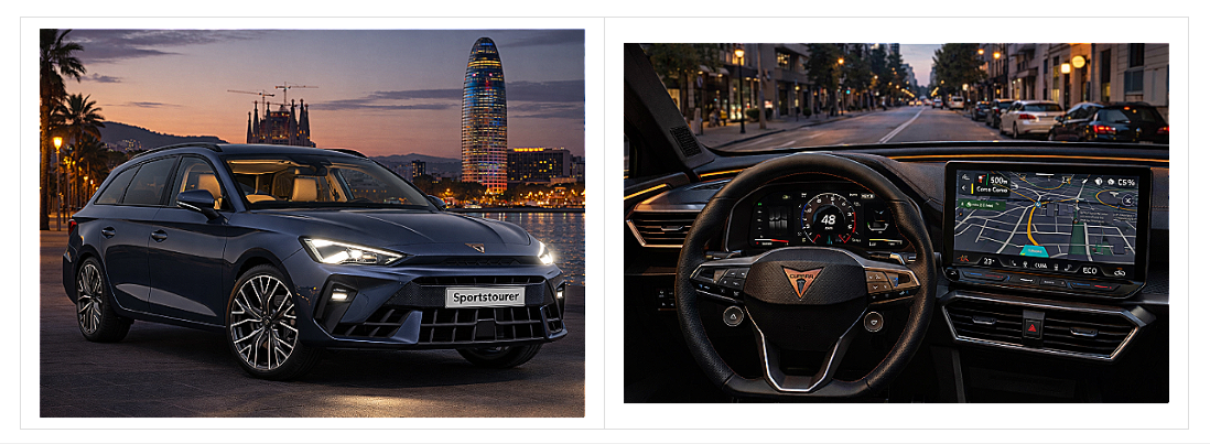 The Cupra Leon Sportstourer is a sporty C-segment station wagon, designed for drivers who want high performance without giving up space and versatility. Compared with the standard Leon, it offers a larger trunk and better everyday usability, while retaining a dynamic driving setup and a strongly sporty identity. The lineup includes gasoline, plug-in hybrid, and high-performance VZ versions, including all-wheel drive on the most powerful variants.