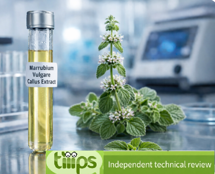 Marrubium vulgare callus extract is a “cell culture” ingredient used in cosmetics for skin conditioning. Practical value depends on grade repeatability (marker standardization such as verbascoside and overall phenolic profile) and on correct formulation management of color, preservation, and compatibility with the matrix.