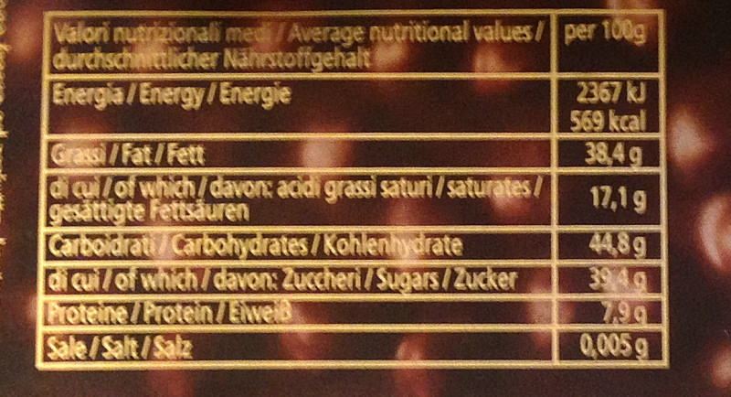 Barcode EAN:   8006380217221 Energy kcal/100g:   539 Satured Fat (per 100g)g:   17.1 Sugar into Carbohydrates (per 100g)g:   39.4 Proteines (per 100g)g:   7.9 Calcium CA/ mg (per 100g)g:   Gluten:   Production type:   Made in:   Italy Price €:   Bought here:   Last update:   2012-10-23 20:46:55 | Brand:   Fat (per 100g)g:   38.4 Carbohydrates (per 100g)g:   44.8 Fiber (per 100g)g:   Salt - Sodium (per 100g)g:   0.005 Ingredients (Indicative):   |