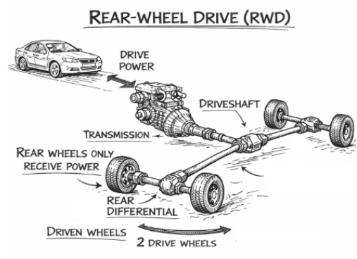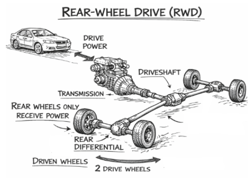 Rear-wheel drive (RWD) is a drivetrain layout in which driving torque is delivered to the rear wheels, while the front wheels are primarily responsible for steering. It is a typical configuration for many premium sedans, sports cars, and vehicles that prioritize robustness or towing capability.