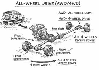 All-wheel drive (AWD/4WD) is a drivetrain layout in which driving torque is distributed to all four wheels, with the goal of increasing traction and stability across a wide range of grip conditions.